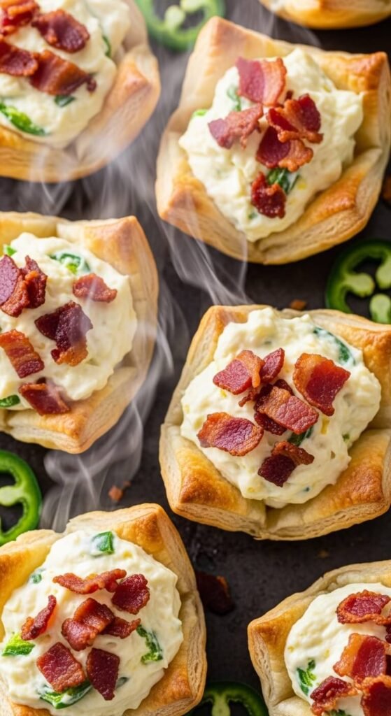 Mix softened cream cheese with diced jalapeños and shredded cheddar. Scoop into pastry squares pressed into muffin tins.