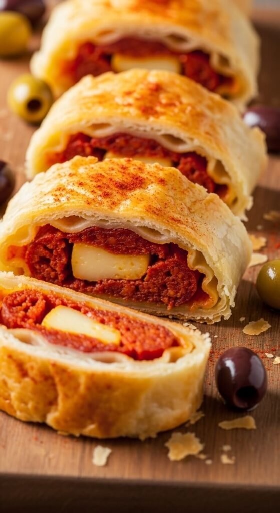 Cook chorizo until crispy. Mix with shredded manchego cheese. Spread on pastry sheet and roll tightly.