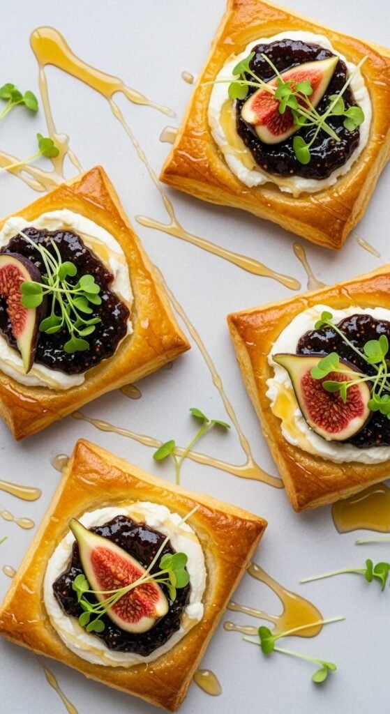 Cut pastry into small squares and bake flat for 10 minutes. Let cool slightly. Top with goat cheese and fig jam.