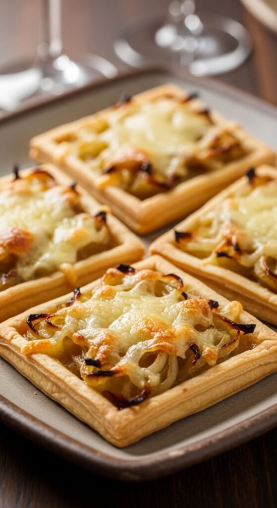 Slice onions thin and cook slowly until golden brown. Cut pastry into squares, dock centers with fork. Top with onions and grated gruyere.