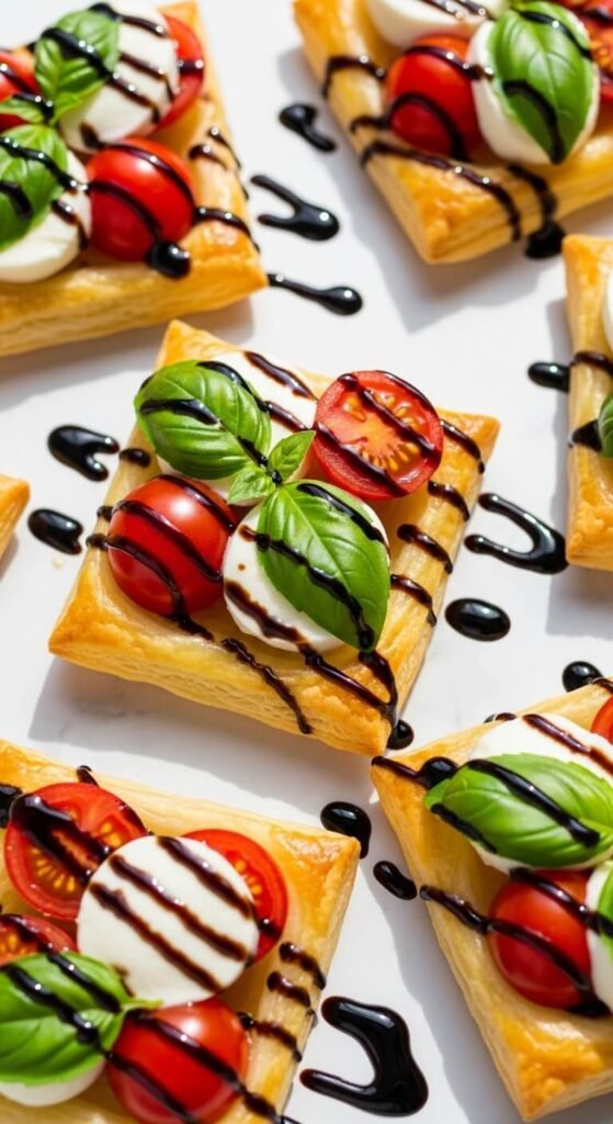 Cut pastry into squares and dock centers. Top with sliced cherry tomatoes and fresh mozzarella. Bake for 13 minutes.