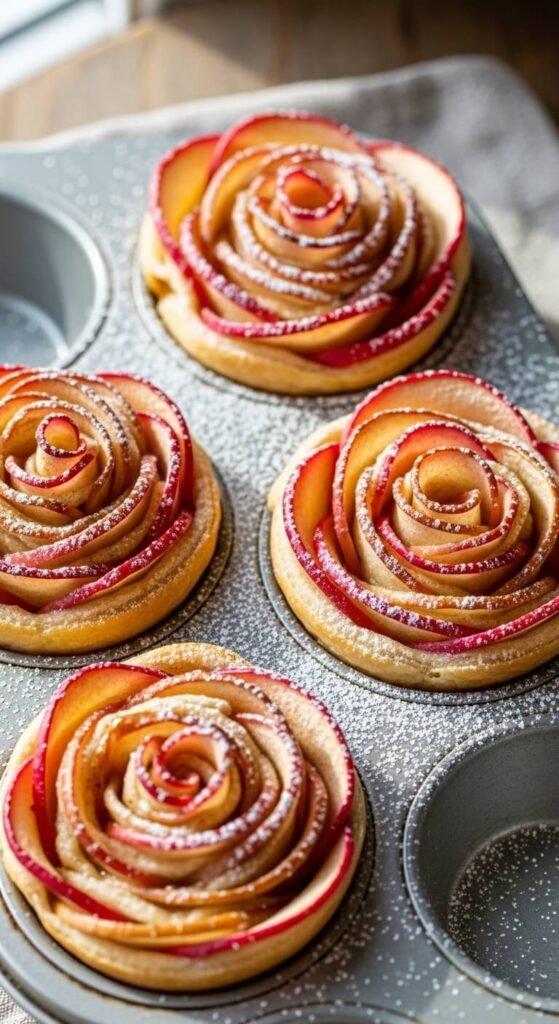 Bake in muffin tins for 16 minutes. Dust with powdered sugar while warm. Use the cheapest apples available. These look impressive but are surprisingly simple. Make them for brunch or dessert. Drizzle with caramel sauce for extra indulgence.