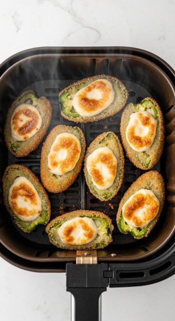 The air fryer makes jalapeño poppers faster and crispier without a deep fryer. Fill and prep your poppers as usual, then air fry at 375°F for 8–10 minutes. The skin crisps up beautifully. No oil needed. Clean-up is minimal too, which is a bonus. This method works great for smaller batches when you don’t want to heat up the whole oven. If you don’t have an air fryer yet, they’re affordable and worth it for snacks like these alone.