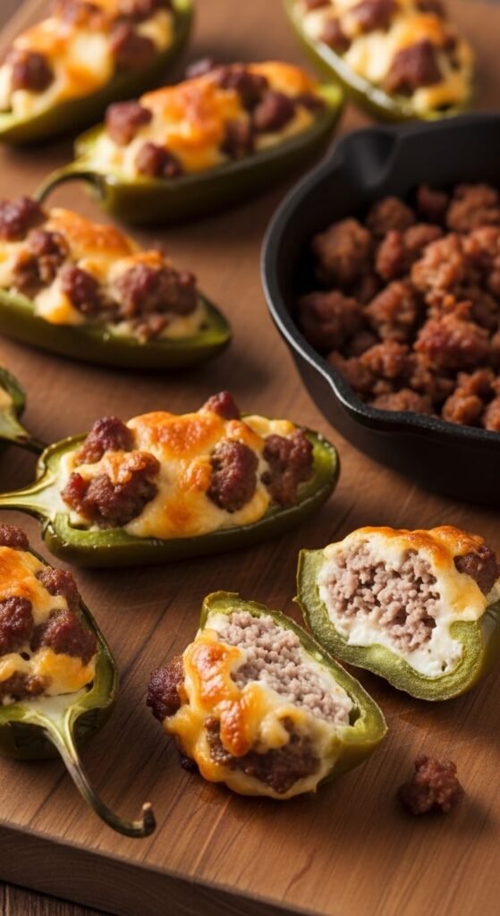 Cook up some breakfast sausage, crumble it fine, and mix it into your cream cheese. This combo is rich, hearty, and seriously satisfying. It’s a great way to stretch a smaller amount of cream cheese further. One pound of sausage mixed with 8 oz cream cheese fills about 20 poppers. These work just as well for brunch as they do for game day snacking. Use mild sausage if your crowd can’t handle too much heat.