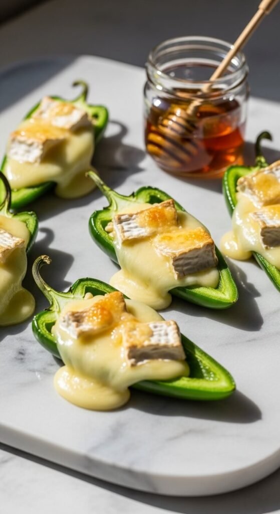 Brie melts into an incredibly smooth, rich filling. Cut small pieces of brie and press them into halved jalapeños. Bake until the brie is gooey. Drizzle with a tiny bit of honey right before serving. The sweet honey, creamy brie, and spicy jalapeño create a really special bite. Brie can feel fancy but it’s often on sale and a small wedge goes a long way. These work great as a party appetizer that looks impressive with minimal effort.