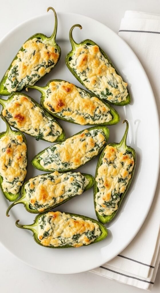 Think spinach artichoke dip in a jalapeño — that’s what this is. Mix sautéed spinach (squeeze out all the water first) with cream cheese. Add a little garlic powder and parmesan if you have it. Stuff and bake. The spinach keeps the filling from being too rich and adds some color. Frozen spinach works perfectly here and is very affordable. This is a crowd-pleaser that feels a little more balanced than straight cream cheese alone.