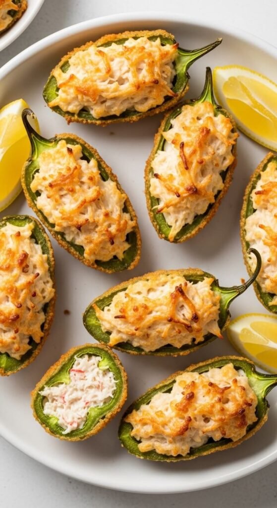 Imitation crab is affordable, easy to shred, and works great mixed into cream cheese for a seafood-style popper. Add a squeeze of lemon juice and a pinch of Old Bay seasoning. Stuff and bake. These taste like a crab dip app at a fraction of the price. Imitation crab is available at almost any grocery store for just a few dollars. If you want to splurge, use real lump crab meat. Either way, the result is creamy, savory, and a little luxurious.