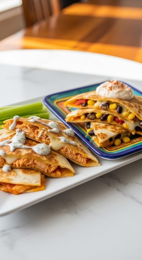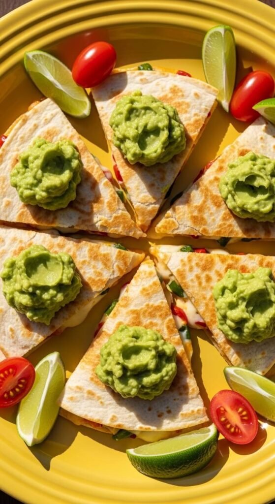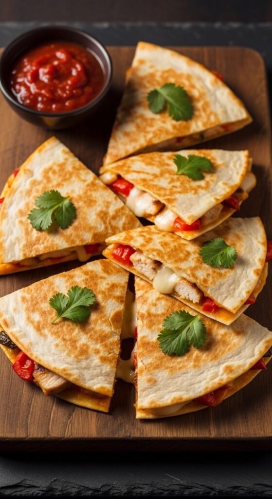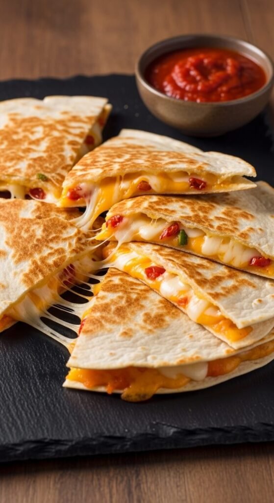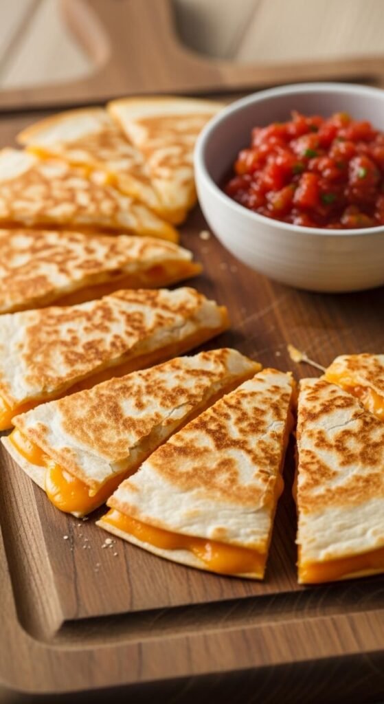 You can’t go wrong with the classic. Sharp cheddar melts beautifully and gives every bite that satisfying pull. Use a large flour tortilla, load up both sides with cheese, and cook on medium heat until golden. Slice into 8 triangles once cooled slightly. Serve with a basic jarred salsa — no shame in that. This is the crowd-pleaser that disappears first. Budget tip: store-brand shredded cheddar works just as well as the fancy block. Keep it simple and let the cheese do the talking.