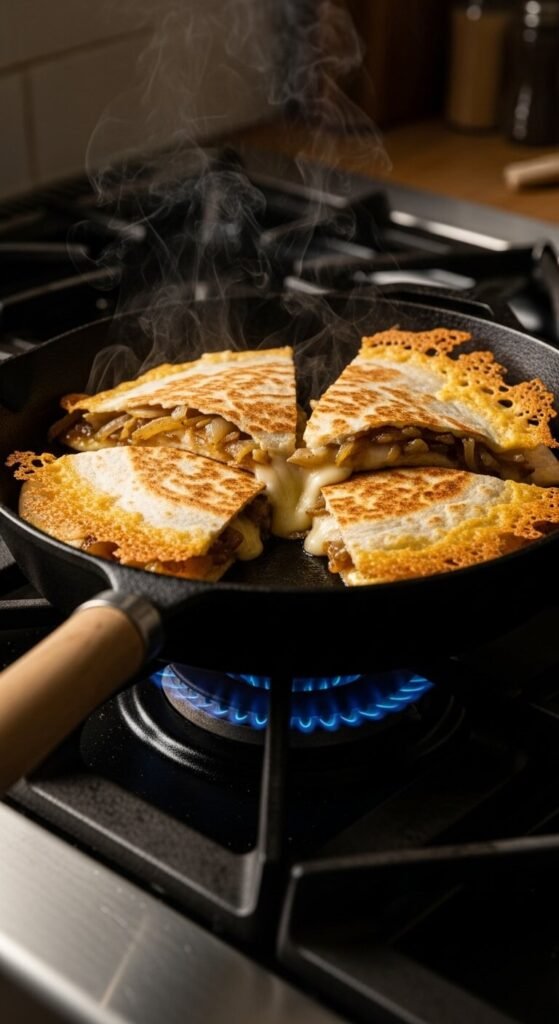 Slow-cooked caramelized onions paired with nutty gruyère is a French bistro-inspired combination that works beautifully in a crispy tortilla. Take your time with the onions — at least 20 minutes on low heat until deeply golden. Add a bit of fresh thyme if you have it. Fold with gruyère and cook until crispy. Budget tip: gruyère can be pricey, but a little goes a long way because the flavor is strong. Swiss cheese is a solid, cheaper substitute that melts just as well.