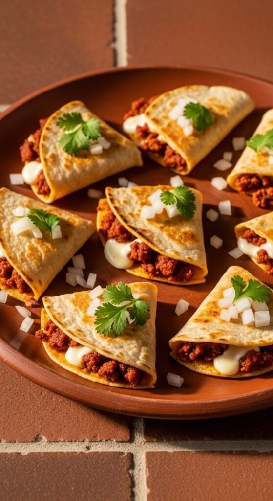 Sometimes the filling is the cheese. Mix equal parts shredded mozzarella, sharp cheddar, and pepper jack for a trio that melts together into something spectacular. Spread generously, fold, and cook on medium heat until deeply golden. Slice into wedges and serve with marinara or simple salsa. Budget tip: buy bags of pre-shredded cheese blends — they’re affordable and already mixed. A two-cup bag fills three to four quesadillas. This recipe proves that you don’t need a complicated filling for an amazing appetizer.