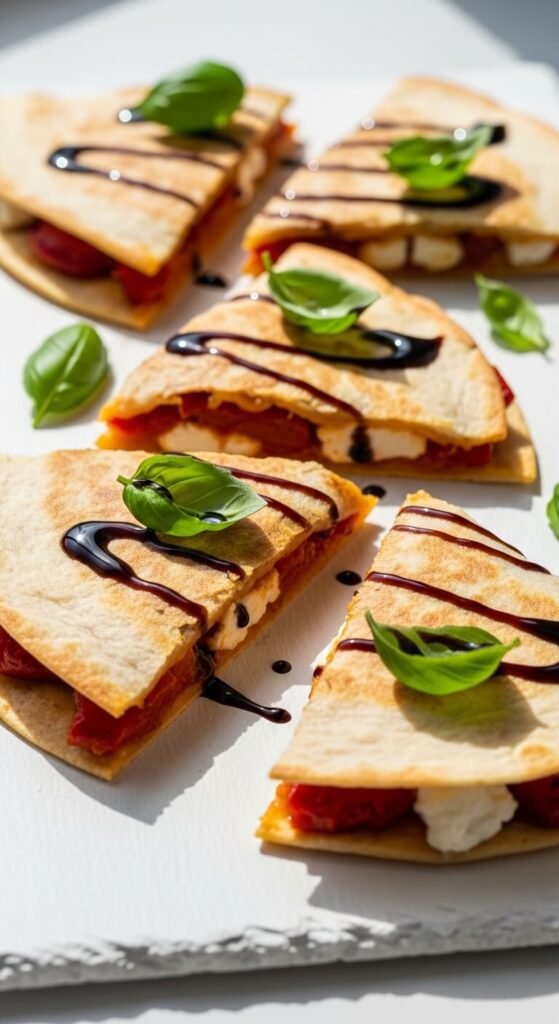 Roasted red peppers from a jar are a pantry hero. Pair them with crumbled goat cheese and a little fresh basil inside a flour tortilla. Cook on medium-low so the goat cheese softens without melting away completely. Slice into thin triangles and drizzle with balsamic glaze. Budget tip: jarred roasted red peppers are affordable and save you time. Goat cheese is a bit of a splurge, but a 4-ounce log stretches across several quesadillas. This one looks fancy without much effort at all.