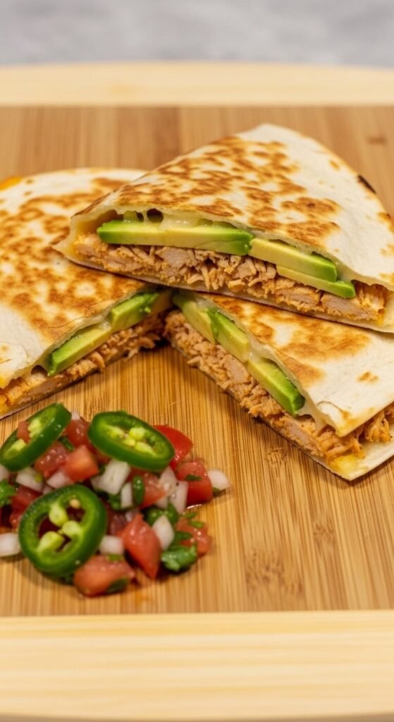 Season shredded rotisserie chicken with cumin, garlic powder, and a pinch of chili powder. Layer inside a tortilla with sliced avocado and Monterey Jack. Cook until golden and slice into wedges. The avocado gets creamy and warm inside — it’s incredibly satisfying. Serve with pico de gallo on the side. Budget tip: rotisserie chicken from the grocery store deli is one of the best value proteins you can buy. One whole chicken fills enough quesadillas for a party of eight when stretched with avocado.