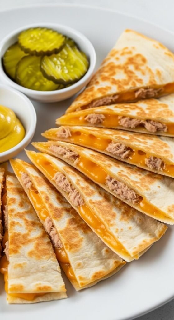 The tuna melt gets a quesadilla makeover. Mix canned tuna with a little mayo, Dijon mustard, and diced celery. Spread inside a tortilla with shredded cheddar, fold, and cook until golden. Slice into strips. It’s hearty, filling, and genuinely tasty. Budget tip: canned tuna is one of the most affordable proteins available — usually around $1 per can. One can fills two quesadillas easily. This works great as a party snack because it’s unexpected and people can’t quite place what makes it so good until you tell them.
