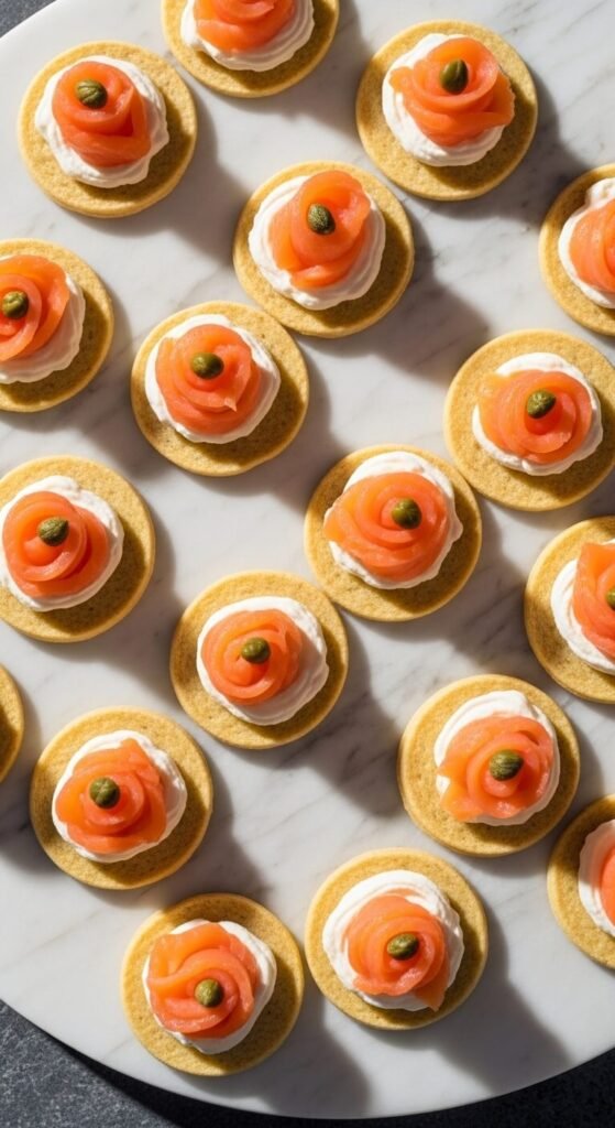 Use a round cookie cutter after cooking to make perfect little circles — instantly party-ready. Spread whipped cream cheese inside a small flour tortilla, add thin slices of smoked salmon, fold carefully, and cook on very low heat just to warm through. Cut into circles or triangles. Top with a caper and a tiny squeeze of lemon. Budget tip: smoked salmon trimmings are sold in smaller, cheaper packages at most grocery stores. They taste identical to the full slices and are perfect for recipes where presentation isn’t as critical.