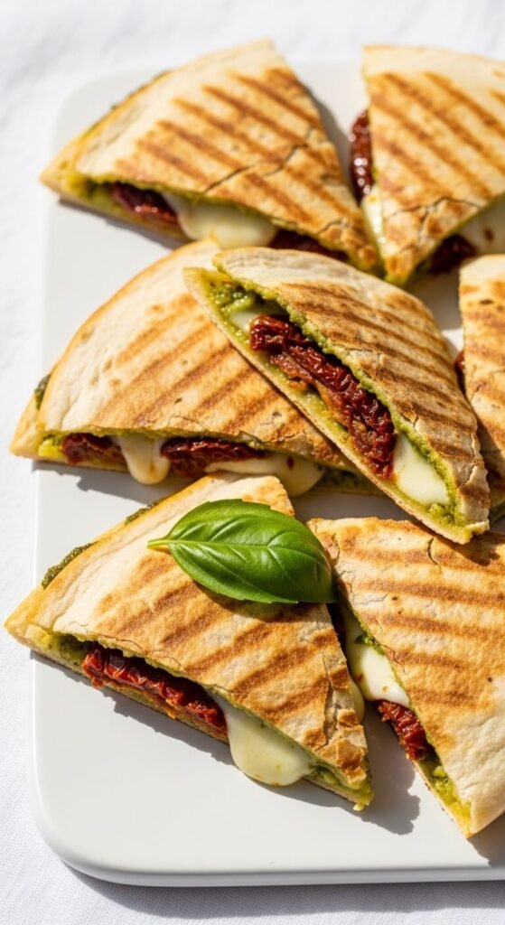 Spread a thin layer of basil pesto on the inside of a tortilla. Add sliced fresh mozzarella and a few sun-dried tomatoes. Fold and cook on medium-low heat. The pesto caramelizes slightly at the edges and smells incredible. Slice into triangles. Budget tip: store-bought pesto in a jar is perfectly fine for this — no need to make your own. Sun-dried tomatoes in oil from a jar are affordable and packed with flavor. One small jar lasts for multiple batches, making the cost per quesadilla very low.