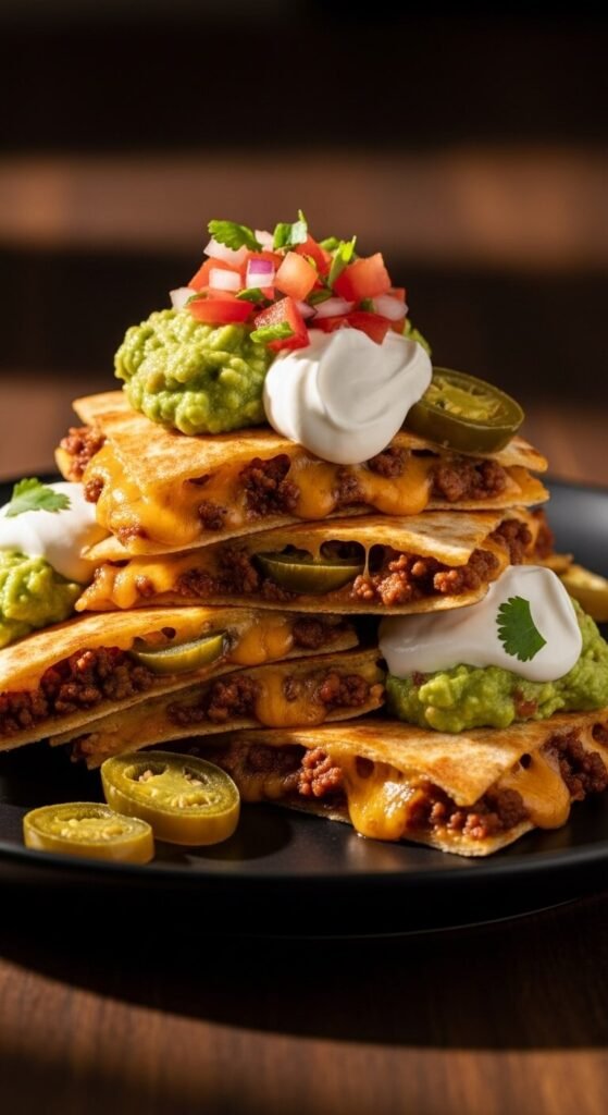Take everything you love about loaded nachos and put it inside a quesadilla. Seasoned ground beef, cheddar, jalapeños, and a little sour cream inside a flour tortilla — cooked until golden. Cut into squares for easier handling at parties. Top each square with a tiny bit of guac, sour cream, and pico. Budget tip: ground beef goes far when seasoned well with cumin, chili powder, garlic, and onion powder. A half-pound fills four quesadillas easily. This is one of the best crowd-pleasers on this entire list.