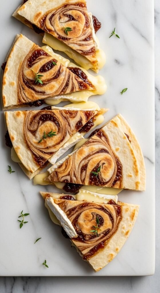 For a more grown-up appetizer spread, try brie and fig jam. The salty, creamy brie against sweet fig jam is a combination that feels expensive but isn’t. Use a flour tortilla, layer sliced brie (rind removed), and add a thin spread of fig jam. Cook on low heat so the brie melts without burning. Slice into thin wedges. Budget tip: buy a small brie wheel — a little goes a long way. Fig jam can be found at most grocery stores for around $4 and lasts for weeks.