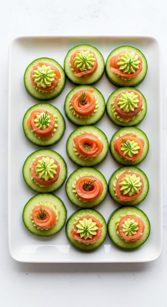 Elegant, bite-sized, and completely no-cook. Slice a large cucumber into rounds about half an inch thick. Mix mashed avocado with cream cheese, lemon juice, and salt until completely smooth. Pipe or spoon the mixture onto each round. Top with a small piece of smoked salmon or just everything bagel seasoning for a fast, flavorful finish. Everything bagel seasoning is a pantry staple that adds enormous flavor instantly. These are naturally gluten-free, low in carbs, and beautiful on any serving board. They also hold up well for up to an hour in the fridge.