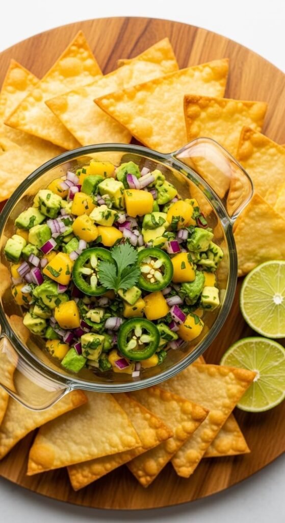 Guacamole’s more textured, exciting cousin. Dice avocado, mango, red onion, jalapeño, and cilantro together. Toss with lime juice and salt. Keep all the pieces intact — do not mash anything. The mango adds sweetness that perfectly balances the heat from the jalapeño. For wonton chips, cut wonton wrappers diagonally, brush lightly with oil, and bake at 375°F for 6 minutes. A single bag of wonton wrappers costs about $2 and yields an enormous pile of chips. This salsa is also great spooned onto grilled chicken or fish.