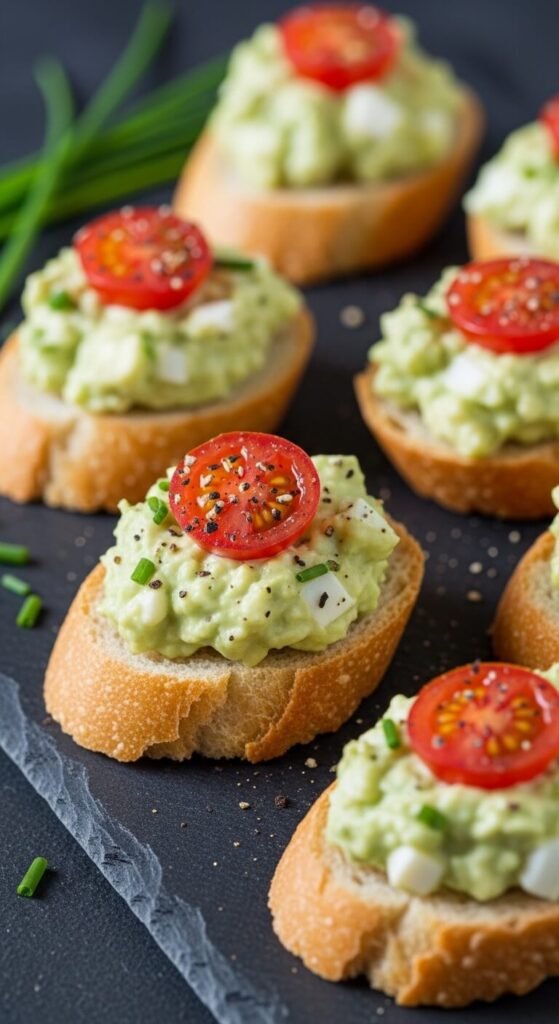 Avocado makes egg salad noticeably creamier and more satisfying. Hard-boil your eggs, chop them roughly, and mix with mashed avocado, Dijon mustard, a squeeze of lemon, and salt. Skip the mayo entirely — the avocado does that job and then some. Spoon onto toasted baguette rounds for easy-to-eat crostini. Slice and toast the baguette the day before to save time when guests are arriving. These are filling and protein-rich, which means they hold people over without anyone diving into the main course before it is ready.