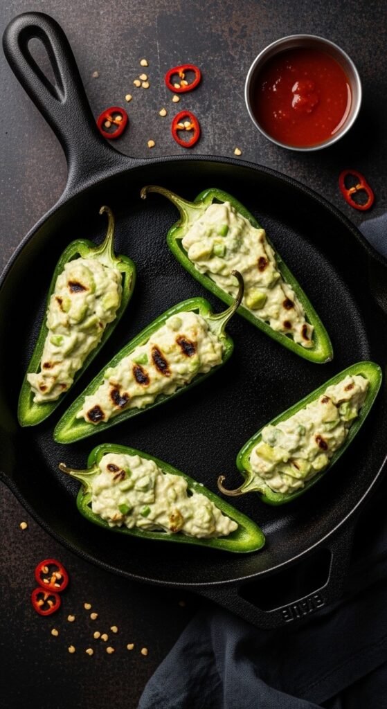 Jalapeño poppers get a serious upgrade here. Halve fresh jalapeños lengthwise and scrape out the seeds. Mix mashed avocado with softened cream cheese, garlic powder, and a pinch of cumin until smooth. Fill each half generously. For a crispy golden top, sprinkle panko breadcrumbs and a little parmesan over each pepper before baking at 400°F for 15 minutes. These are spicy, creamy, and completely addictive. Want more heat? Leave a few seeds in. They cost almost nothing to make and always spark requests for the recipe.