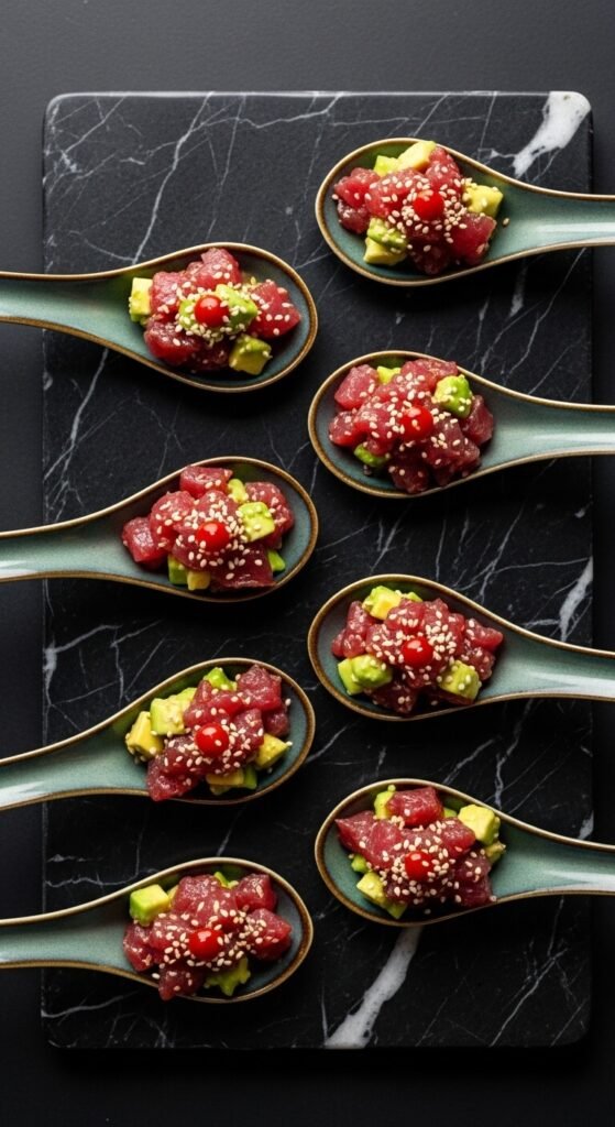 Tartare sounds intimidating but it is simply finely diced raw fish and avocado. Use sushi-grade tuna and cut it into small, even pieces. Mix with diced avocado, soy sauce, sesame oil, and a touch of sriracha. Spoon into individual ceramic appetizer spoons or small glasses. Buy sushi-grade tuna at an Asian grocery store — far better quality at a much lower price than standard supermarkets charge. Top each spoon with sesame seeds. These look spectacular at dinner parties and take under 20 minutes from cutting board to table.
