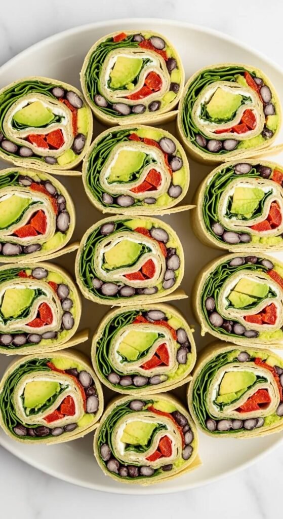 Pinwheels are the ultimate make-ahead party food. Spread mashed avocado and softened cream cheese over a large spinach tortilla. Layer with canned black beans, roasted red peppers, and shredded cheddar. Roll the tortilla tightly, wrap in plastic wrap, and refrigerate for at least one hour to firm up. Slice into clean rounds right before serving. The tighter the roll, the neater and more attractive each slice looks. These cost about $4 total for a full roll, require zero cooking, and look colorful and professional on any platter.