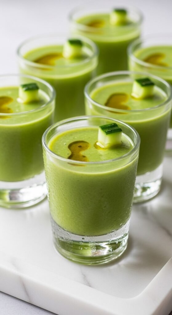 Cold soup shots are dramatic, unexpected, and always get people talking. Blend ripe avocado, cucumber, lime juice, a small garlic clove, cold water, and salt until the texture is completely smooth. Strain for a silkier result or leave as-is for more body. Pour into small shot glasses and refrigerate until ice cold. A drop of hot sauce on top adds a sharp, contrasting finish. These are dairy-free, gluten-free, and ideal for warm-weather entertaining. Blend the night before, keep covered in the fridge, and pour into glasses right as guests arrive.