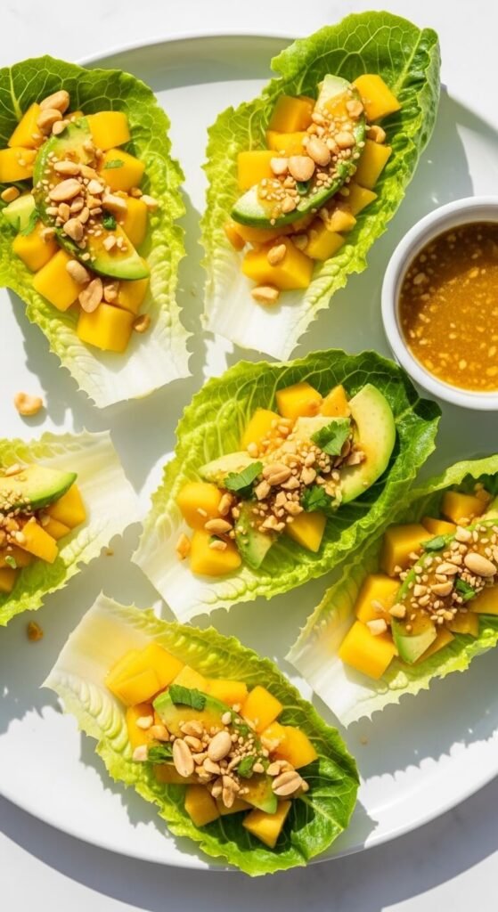 Light, crunchy, and absolutely zero fuss. Use butter lettuce leaves as edible cups — they hold their shape well without wilting. Fill each one with diced mango and avocado. Add crushed peanuts for crunch. Drizzle with a quick dressing made from lime juice, fish sauce, honey, and a drop of sesame oil. Butter lettuce heads cost about $2 at most grocery stores. These are naturally gluten-free and light enough that guests always reach for a second. They work especially well at outdoor parties or warm-weather events where heavy food feels like too much.