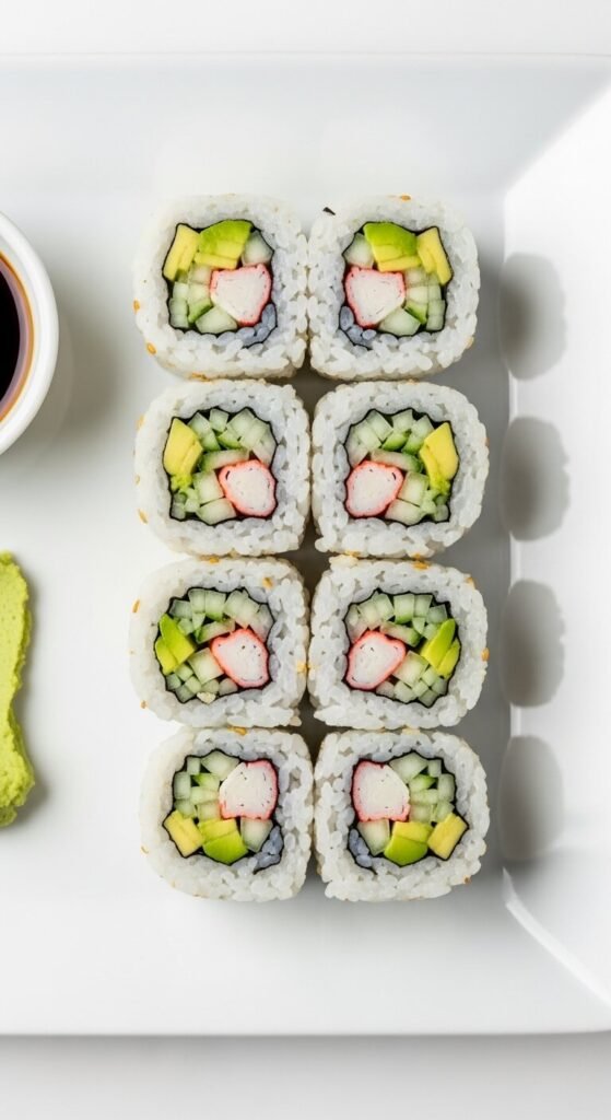 Homemade sushi sounds difficult but it is far more manageable than most people expect. Cook and season sushi rice following the package instructions. Lay nori on a bamboo mat, spread rice evenly, and add avocado slices, cucumber strips, and imitation crab. Roll tightly, press firmly, and slice with a sharp, wet knife. Wetting the blade between cuts gives you clean, restaurant-style slices every time. A bamboo sushi mat costs about $3 online. These California rolls make a stunning appetizer platter and cost a fraction of what you would pay at a restaurant.
