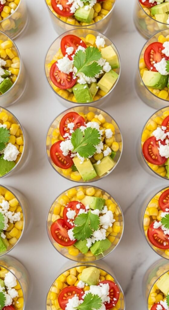Individual portion cups are perfect for standing parties where plates are impractical. Layer roasted corn, diced avocado, halved cherry tomatoes, and crumbled queso fresco in small clear cups. Drizzle with lime juice and a pinch of chili powder. Roast frozen corn in a dry skillet for about 5 minutes until it gets slightly charred and smoky — that one step makes an enormous flavor difference. Assemble up to two hours ahead and refrigerate. The layers show beautifully through the clear walls without any extra styling or effort on your part.