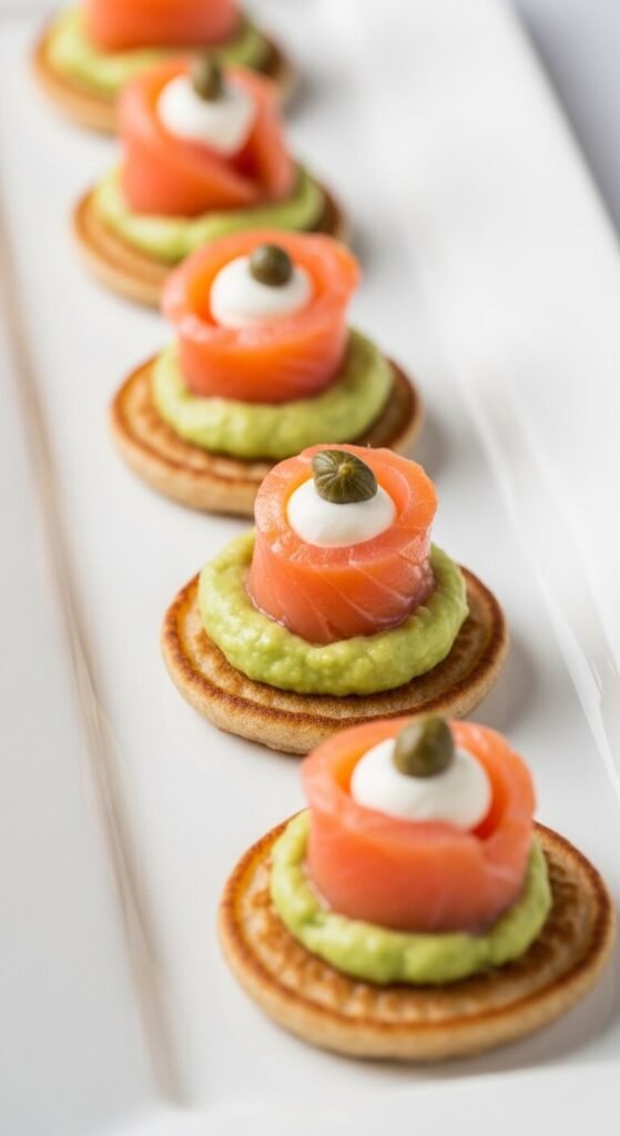 Blini are small, fluffy savory pancakes that make the ideal base for upscale-looking bites. Use a store-bought blini mix or pour small rounds of basic pancake batter into a hot pan. Top each cooled blini with a layer of smooth avocado cream — mashed avocado with lemon and salt. Add a fold of smoked salmon and a small dollop of crème fraîche. A single caper placed on top adds a briny, salty pop that ties the whole bite together perfectly. These look extremely polished and can be assembled up to 30 minutes before guests arrive.