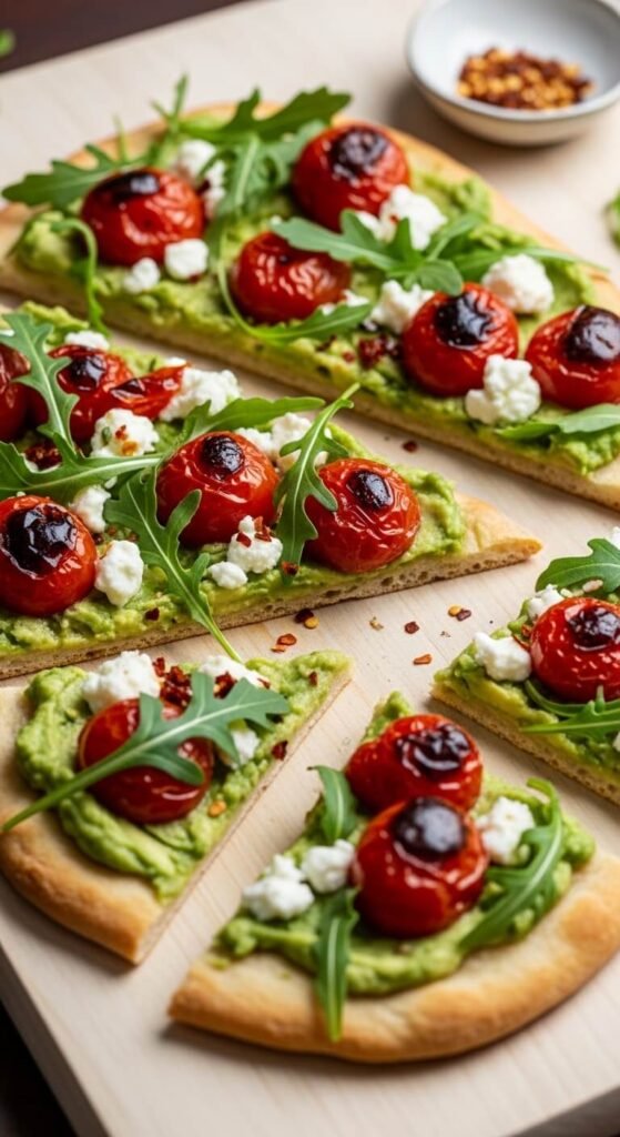 Flatbread appetizers are simple to share and easy to slice into portions. Spread mashed avocado generously over a store-bought naan or flatbread. Roast cherry tomatoes at 400°F for 20 minutes until blistered and caramelized. Scatter them over the avocado. Add crumbled feta and a handful of arugula. Finish with a drizzle of honey — the sweet and salty contrast surprises guests every time. Cut into strips or squares for easy passing. This costs around $5 to make but tastes and looks like something you would order off a gastro pub menu.