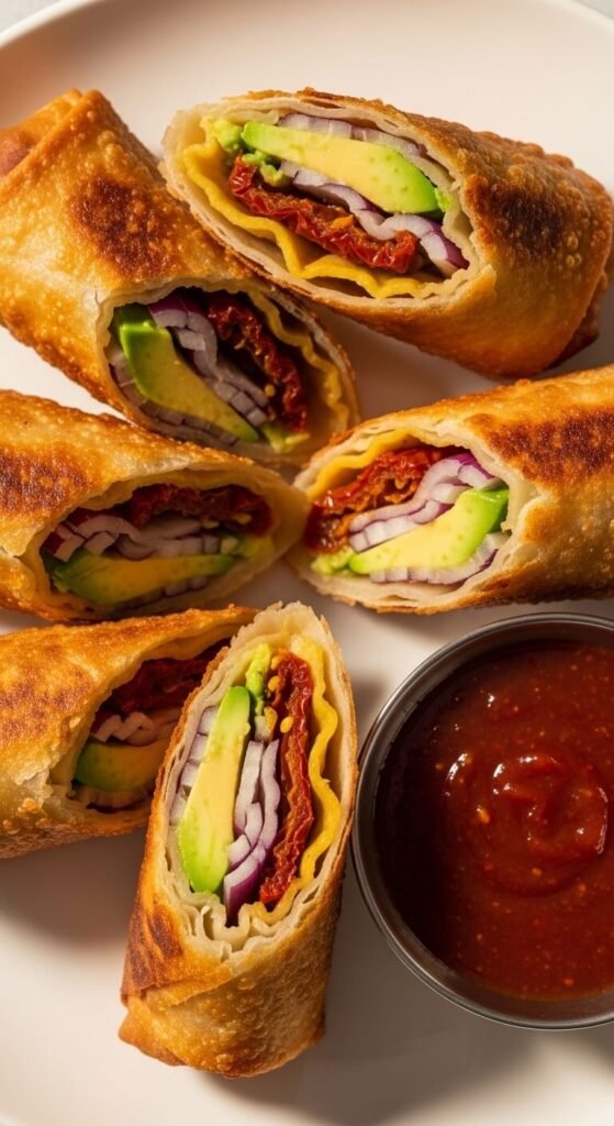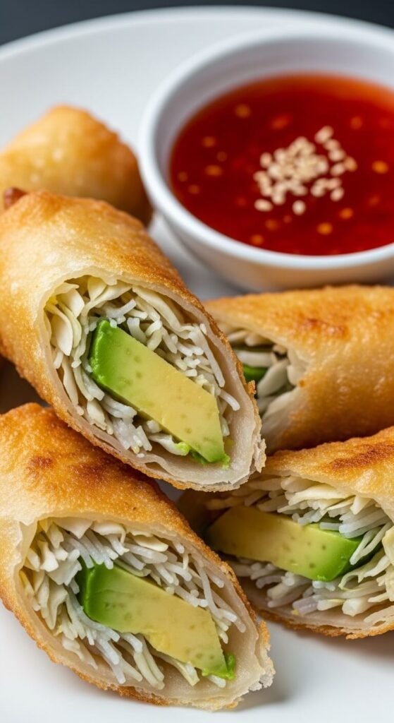 Crispy outside, creamy inside — these rolls hit every texture at once. Fill egg roll wrappers with sliced avocado, shredded cabbage, and thin rice noodles. Roll tightly and either fry until deep golden or bake at 400°F for 18 minutes for a lighter, less messy version. Serve with store-bought sweet chili sauce. Baking cuts both calories and cleanup time significantly. Assemble the rolls the night before and store in the fridge uncooked. Cook them right before guests arrive for maximum crunch and the best possible texture.