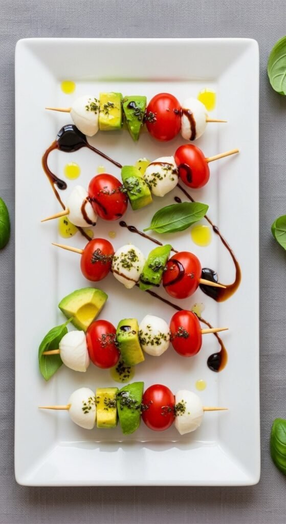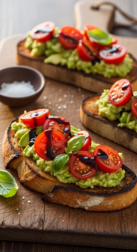 Classic bruschetta gets a creamier, more satisfying upgrade here. Toast thick sourdough slices until the edges are deeply golden. Smash half an avocado onto each piece and season with salt and cracked black pepper. Pile on halved cherry tomatoes and finish with a drizzle of balsamic glaze. The combination of crunch, creaminess, and tangy sweetness is genuinely hard to beat. Use day-old sourdough — it toasts better than fresh and costs less. These work well as passed appetizers or stacked on a grazing board.