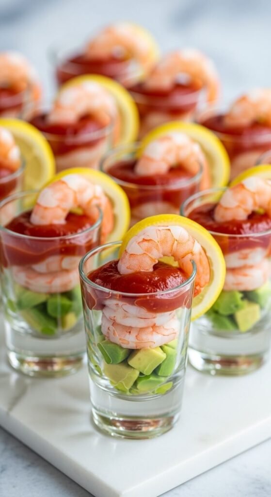 Individual appetizer cups always look like they came from a catered event. Layer diced avocado at the bottom of small clear glasses. Add cooked cocktail shrimp and a spoonful of spicy cocktail sauce. Squeeze fresh lime over the top before serving. Frozen shrimp works perfectly — thaw overnight, peel, and pat dry. These cost about $1.50 per cup and look stunning on a tray. Assemble up to one hour ahead and refrigerate. Guests can pick them up without a plate, which makes mingling easy.