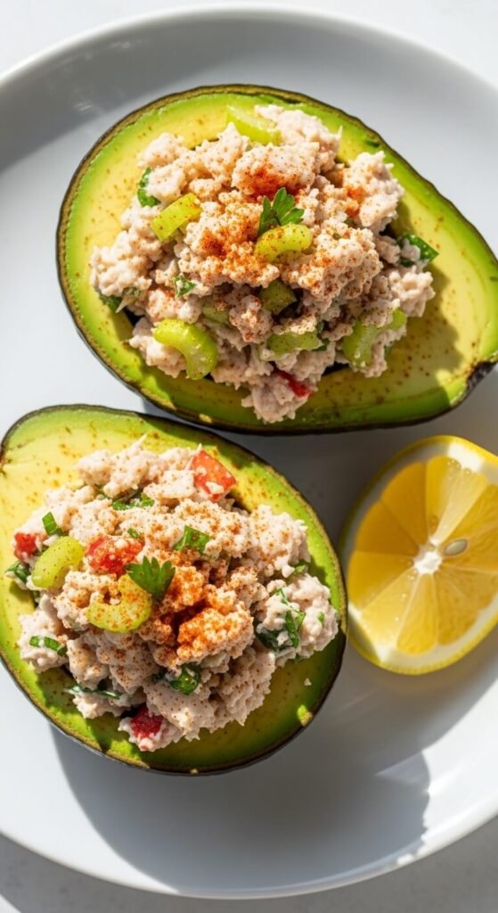 Avocado halves are their own edible bowl — no extra dishes needed. Mix imitation crab meat with a small amount of mayo, diced celery, lemon juice, and salt. Scoop the mixture into each avocado half and dust with paprika. Imitation crab keeps the cost low while still delivering real flavor and texture. Real crab works too if the budget allows. These take about 10 minutes to put together and always look restaurant-quality on a platter. Chill for 20 minutes before serving for the cleanest presentation.