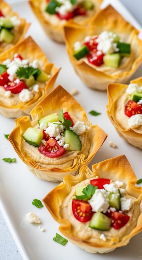 Top with diced cucumbers, tomatoes, olives, or feta right before guests arrive. The cups stay crispy while the filling stays cold and creamy.