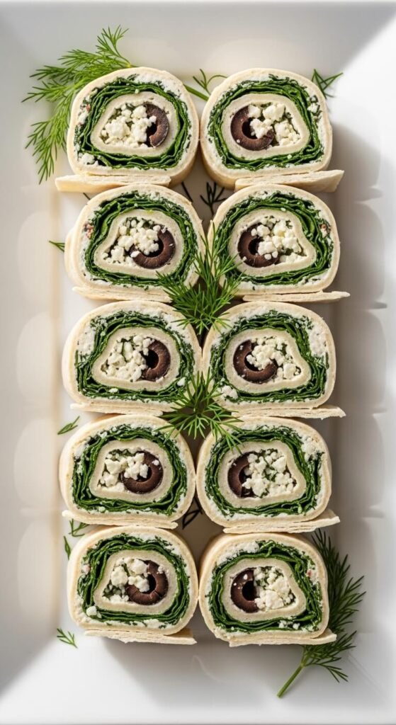 Spread cream cheese mixed with feta, spinach, and olives on tortillas up to three days early.