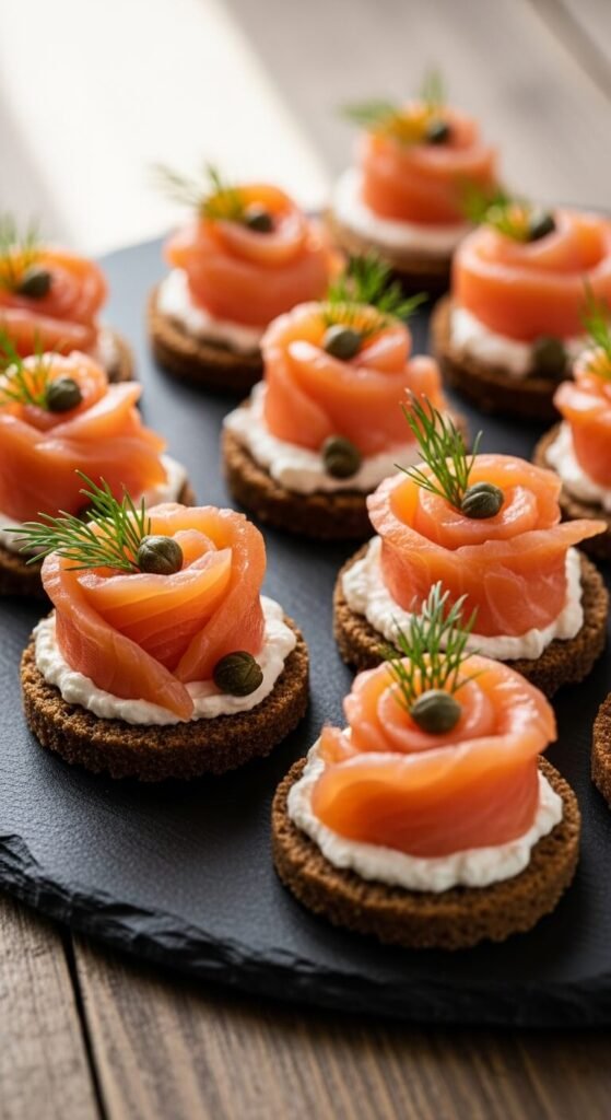 Buy smoked salmon trimmings instead of perfect slices—they’re half the price and work great. Use crackers instead of bread to save money.
