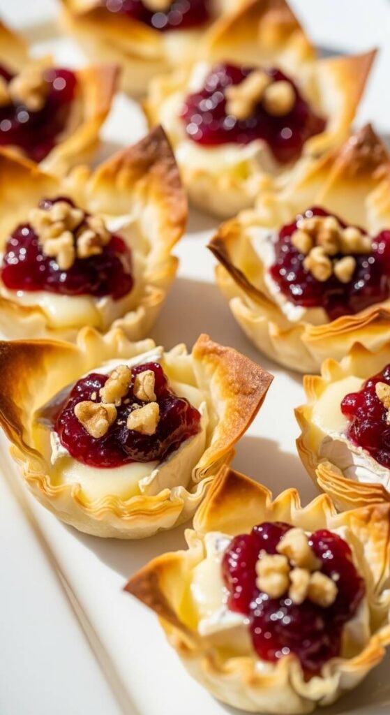 Fill phyllo cups with brie chunks and cranberry sauce, then freeze on a baking sheet.