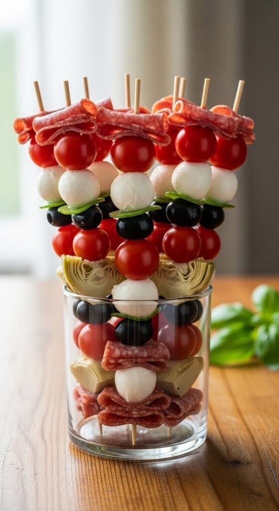 Store them upright in a tall container in the fridge. They stay fresh and look impressive standing up. Each skewer is basically a deconstructed Italian sub.