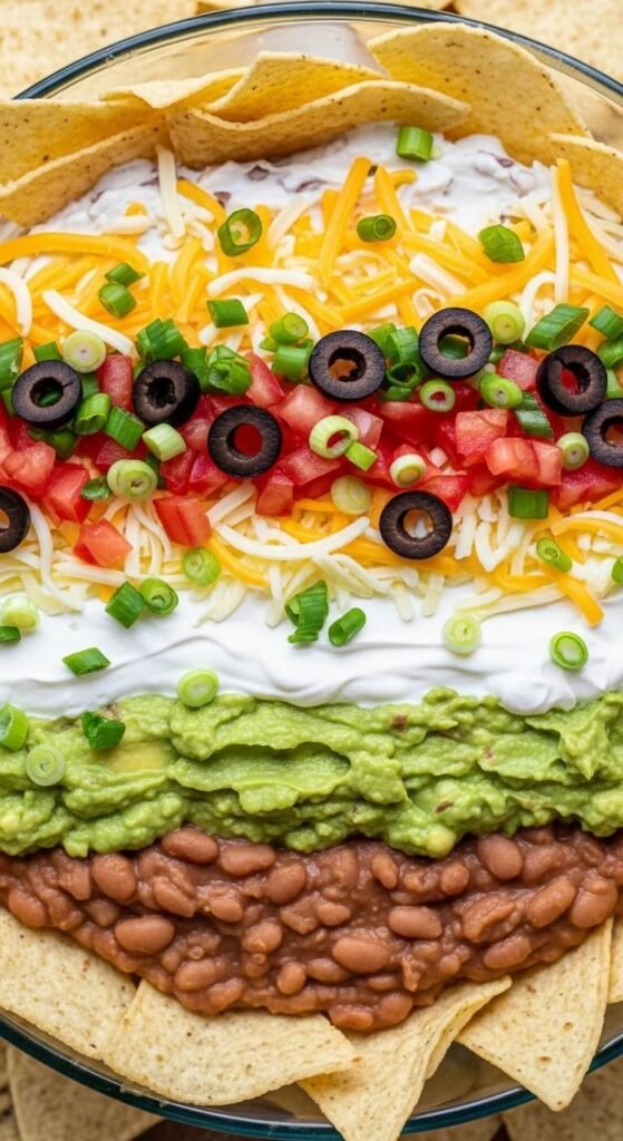 Layer refried beans, sour cream, guacamole, cheese, tomatoes, olives, and green onions in a dish.