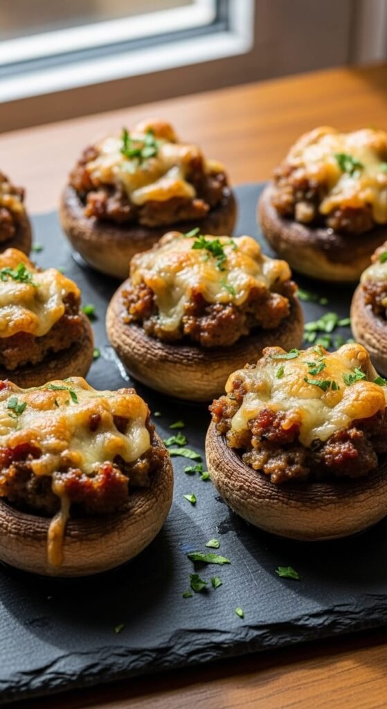 Store them covered in the fridge on a baking sheet. Bake for 20 minutes when guests are on their way. The mushrooms release moisture while the filling stays rich and savory.
