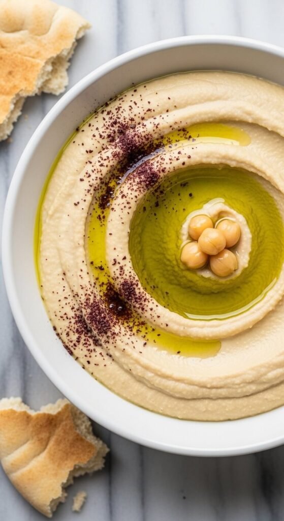 Za’atar is a Middle Eastern herb-and-spice blend made from thyme, sesame seeds, sumac, and salt. Stir several tablespoons into olive oil and pour generously over plain hummus. No blending required — this is a topping-forward recipe. The result is fragrant, oily, and deeply savory. Eat it with flatbread the traditional way. Za’atar is available at Middle Eastern grocery stores and online for around $4–6 a bag that lasts months.