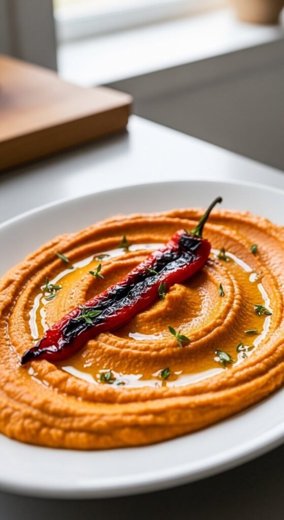 This one brings real color and sweetness to your snack table. Roast red bell peppers directly over a gas flame or under a broiler until charred all over. Peel off the skin, remove seeds, and blend right into your hummus base. One jar of store-bought roasted peppers also works well and costs under $2. Add a pinch of smoked paprika for depth. The final dip is bold, slightly smoky, and goes great with pita chips.