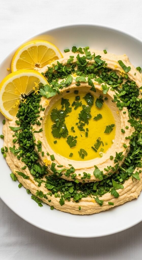This version is lighter and more refreshing than the classic. Use double the lemon juice and plenty of fresh herbs. Parsley, chives, and a little dill work well together. Blend half the herbs into the chickpeas and fold the rest in by hand for texture. The zest from one lemon adds fragrance without extra sourness. Great for spring and summer gatherings. Costs almost nothing extra if you already have herbs growing at home.