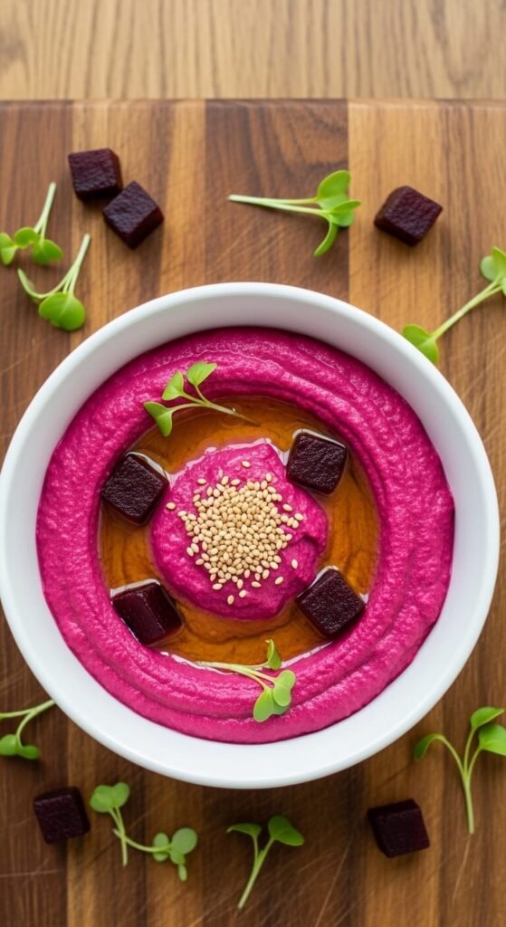Beet hummus is visually striking and surprisingly easy. One small roasted beet turns everything a vivid magenta. Wrap a raw beet in foil and roast at 400°F for 45–60 minutes, or buy pre-cooked beets from the grocery store to save time. Blend with your standard hummus ingredients. The flavor is earthy and slightly sweet. It’s a showstopper on any platter and costs just a dollar or two more than regular hummus.