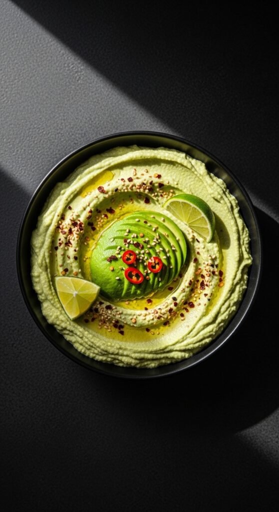 This is hummus and guacamole’s best mashup. Use one ripe avocado per can of chickpeas. Blend together with lime juice, garlic, tahini, and a small jalapeño if you like heat. The texture becomes extra creamy and rich. Eat it the same day — avocado browns quickly. Make a small batch so nothing goes to waste. Serve with tortilla chips for a fun cross-cultural snack board.