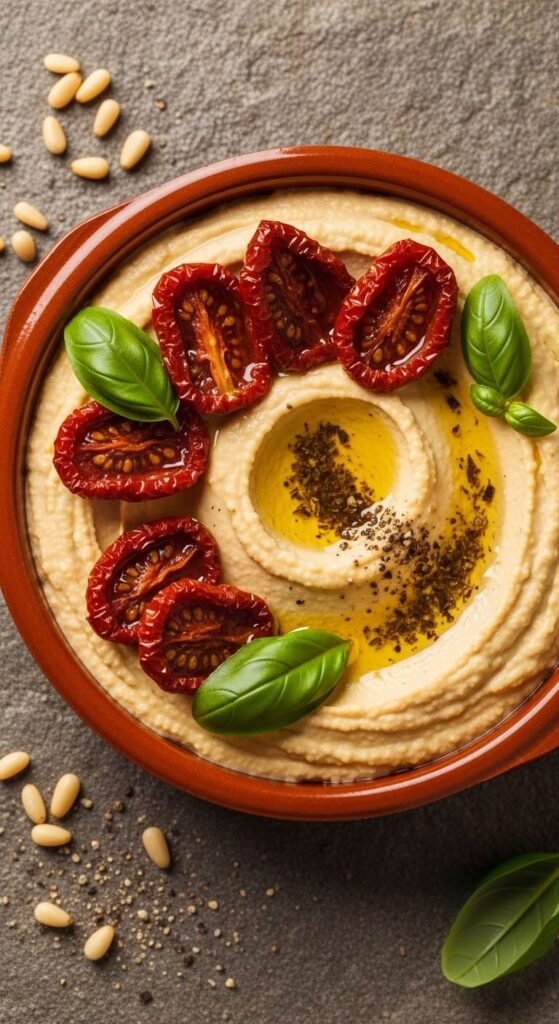 Sun-dried tomatoes bring a concentrated, tangy-sweet punch. Use the oil-packed variety — drain them but keep a tablespoon of the oil to blend in. That oil carries a lot of flavor. Combine with chickpeas, lemon, tahini, and a fresh garlic clove. Finish with a few torn basil leaves on top. This hummus works beautifully on sandwiches or as a dip for grilled vegetables. A small jar of sun-dried tomatoes costs about $3 and makes multiple batches.